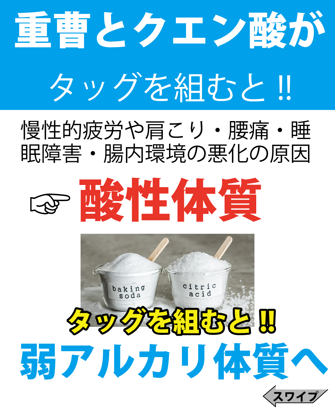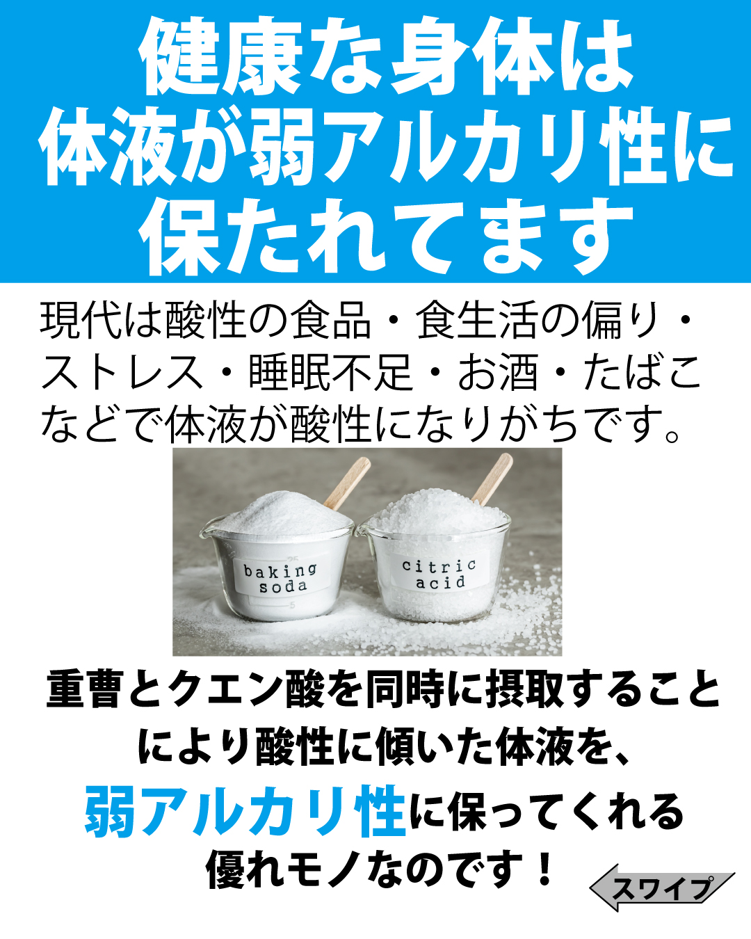 必須アミノ酸 9 種類・必須ビタミン 13 種類・必須ミネラル 16 種類配合 ■なぜ?クエン酸と重曹? 普段から食生活や睡眠時間などに乱れがある方や十分な運動ができていない方、精神的にストレスを 抱えられている方は気づかないうちに身体の状態が酸性に傾いています。 身体が酸性体質に変化することで慢性的な疲労感や肩こり、腰痛、腸内環境の悪化などが起こりやすく、 中でも腸は脳と関係性が強く腸内環境が乱れると自律神経も乱れるため 睡眠障害や気力の低下、偏頭痛なども加えて発生しやすくなります。 これらの不調を緩和解消させるには『酸性化した身体を弱アルカリ性』にするのが 【クエン酸 重曹】なのです。 |