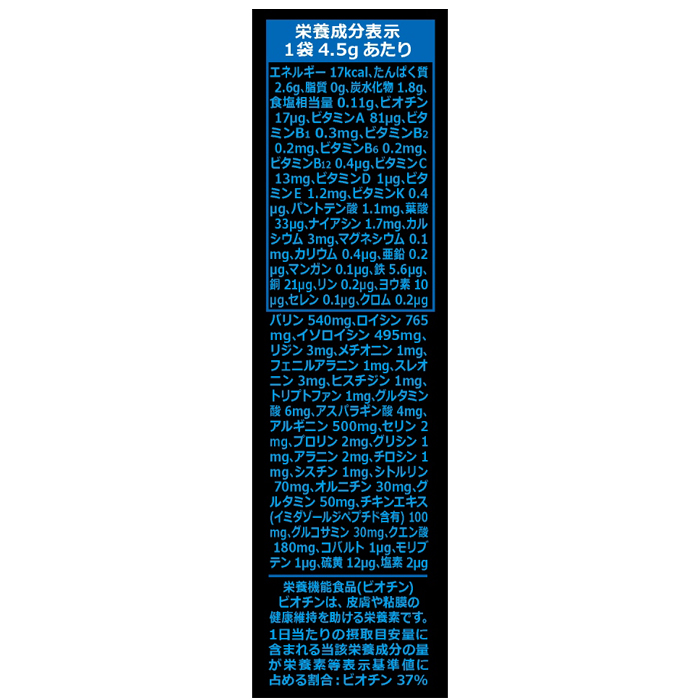 ■水中最速で泳ぐバショウカジキから学んだ当社独自のBCAAアミノ酸配合率 {1.2(バリン):1.7(ロイシン):1.1(イソロイシン)}は、水中競技のアスリートをサポートします。 ■クエン酸・グルコサミン・イミダゾールジペプチド配合 ■毎日必要な必須成分38種類配合 (必須アミノ酸9種類・必須ビタミン13種類・必須ミネラル16種類) ■成長に大切なアルギニン・シトルリン・オルニチン配合 ■手軽に持ち運べるスティックタイプ ■人口甘味料不使用 |